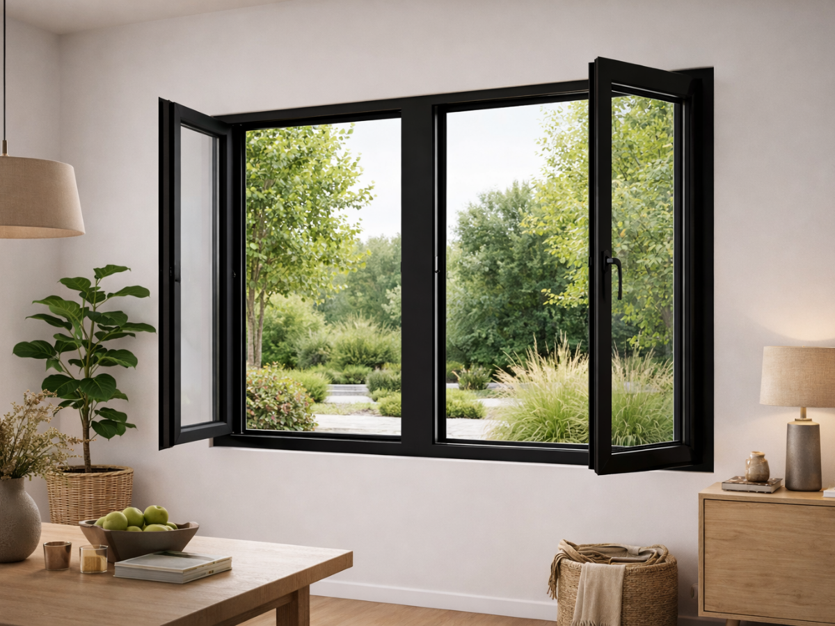 Kunststofffenster weiß Kunststoff einflügelig geöffnet mit großer Glasfläche, modern